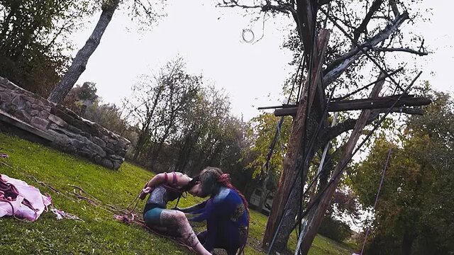 A sexy tattooed girl gets tied up in shibari bondage and suspended from a tree in a public place. Her tight body is on display as she's expertly bound. He then fucks her hard while she's tied up, giving her a hot creampie.